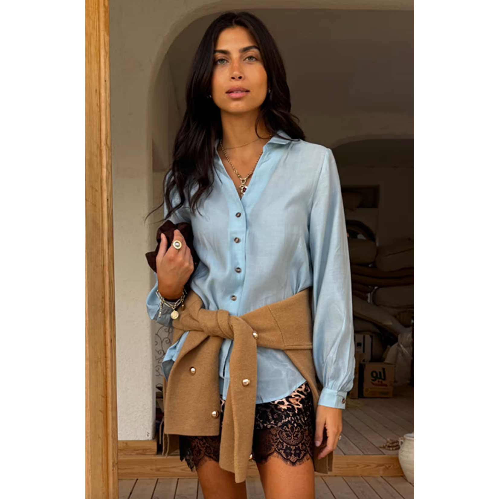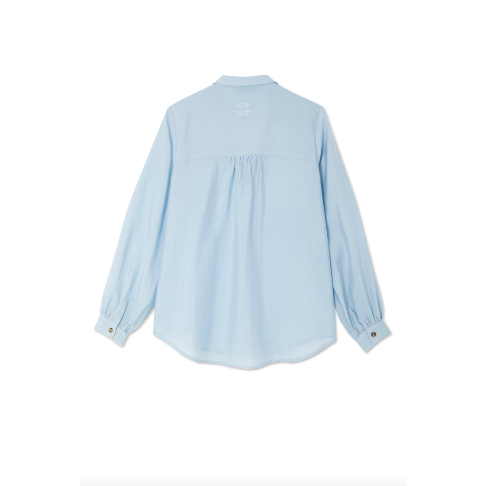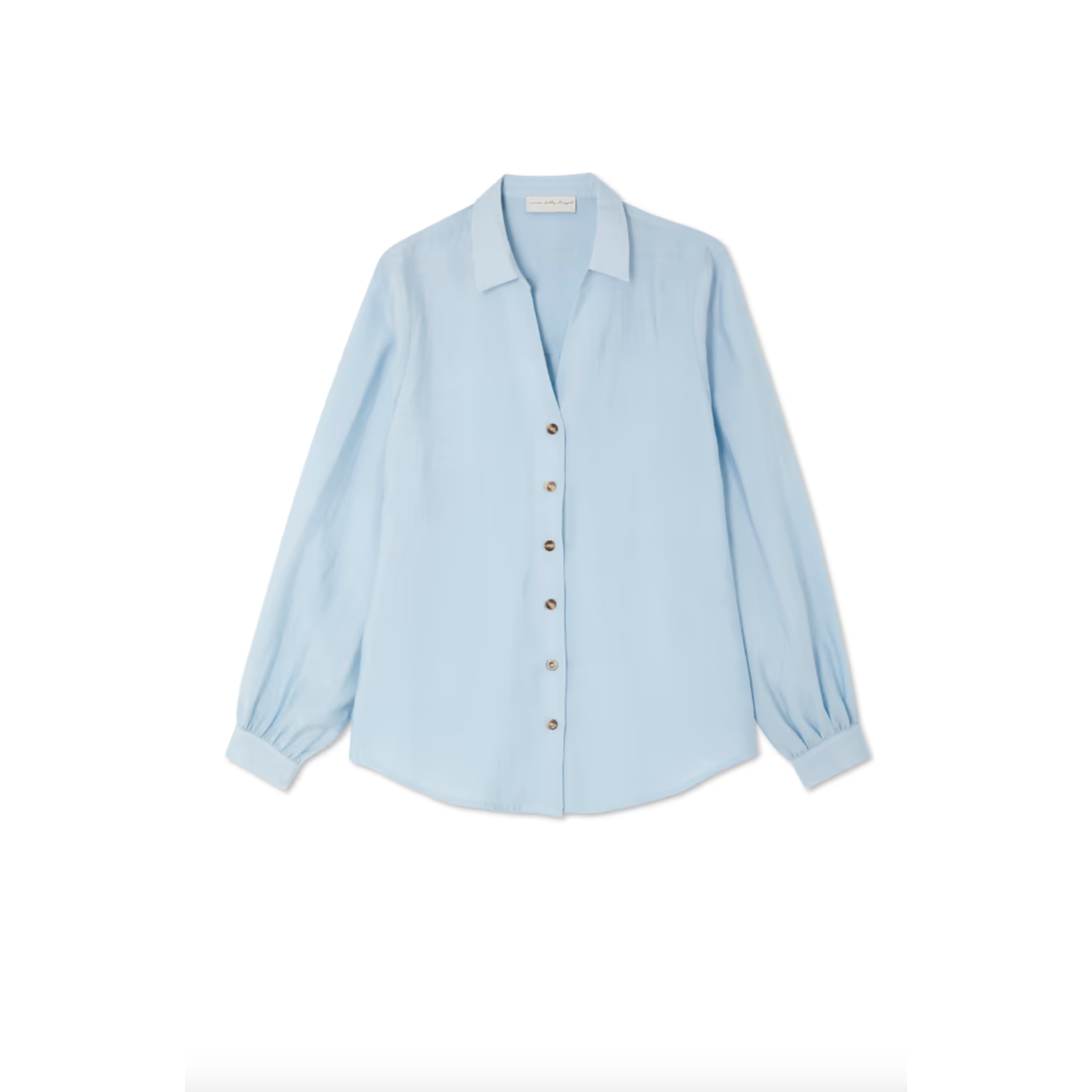 The Never Fully Dressed Ice Blue Miley Shirt is an effortlessly elegant piece designed for everyday wear. Cut in a soft sky-blue tone, it features blouson sleeves and a floaty silhouette with a subtle sheerness that feels light and luxurious while remaining perfectly wearable for work.