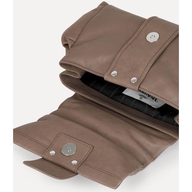 The Vivienne Westwood Hazel Treasure Handbag in grey/taupe is crafted from soft calf leather and finished with the house’s iconic rebellious detailing. Its gently structured silhouette features archival ‘punk pockets’ on either side, while the sculptural belt strap — embossed with the signature Orb motif — wraps elegantly around the ruched body. The soft neutral tone elevates its versatility, and the removable silver-tone chain strap allows it to be worn as a shoulder bag or styled as a chic clutch.