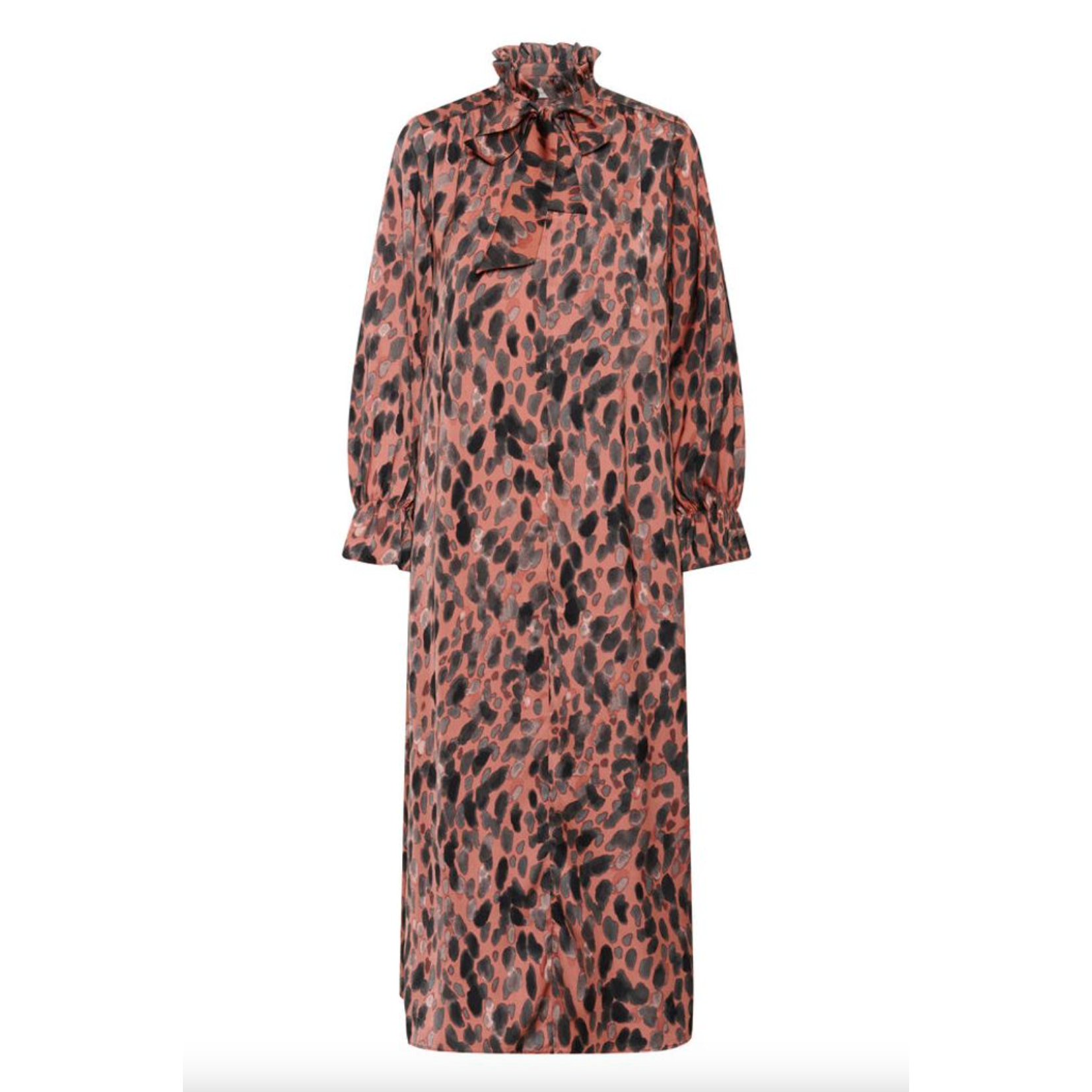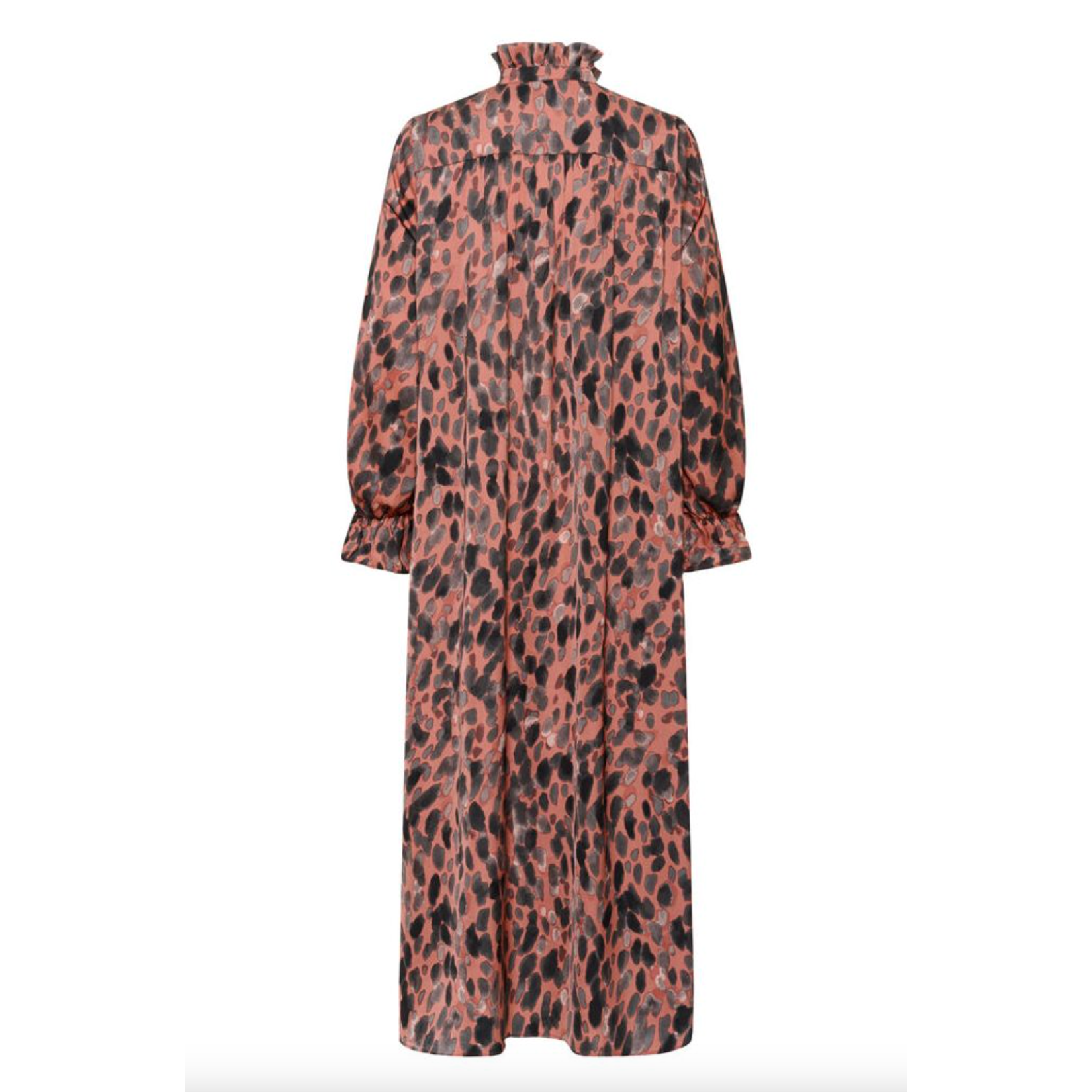 This dress blends romance with modern edge. The abstract print feels unique without overpowering, and the ruffled detailing adds delicate structure. Its relaxed fit makes it comfortable for all-day wear while still looking polished and intentional.