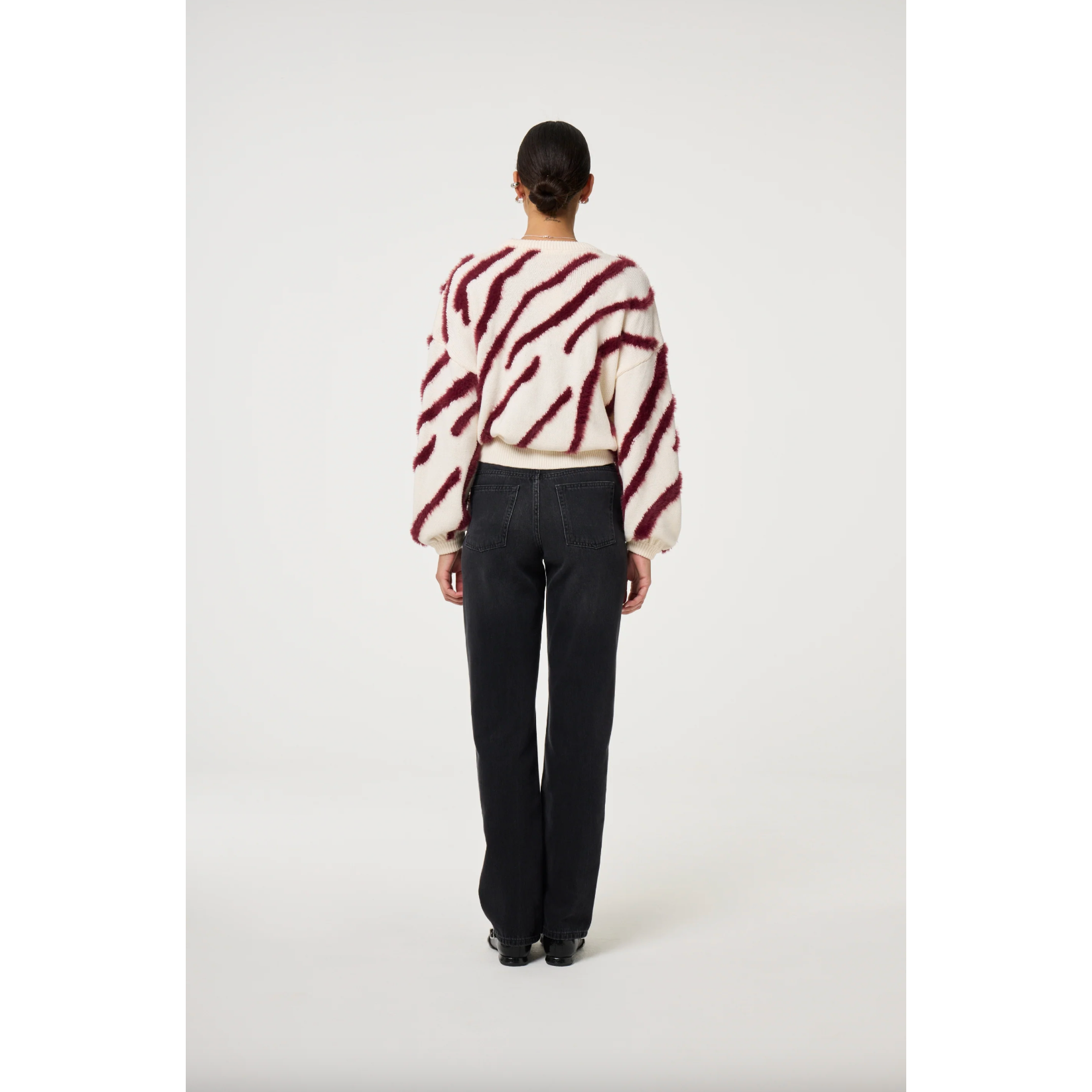 We love how this pullover brings statement style into everyday wear. The burgundy pattern pops beautifully against the creamy background, while the soft organic cotton blend ensures it feels as good as it looks. It’s a versatile piece that pairs effortlessly with denim, tailoring, or layered skirts.