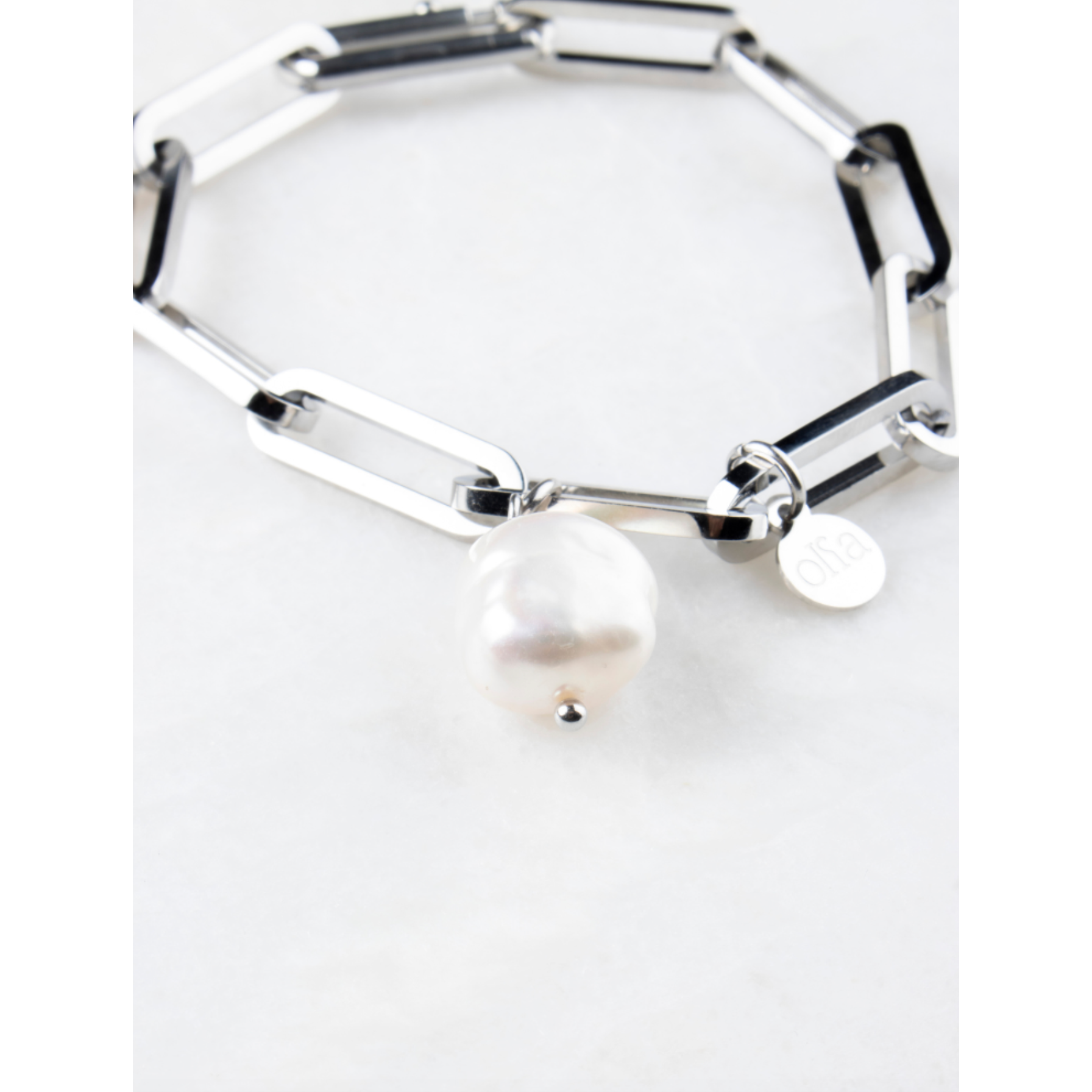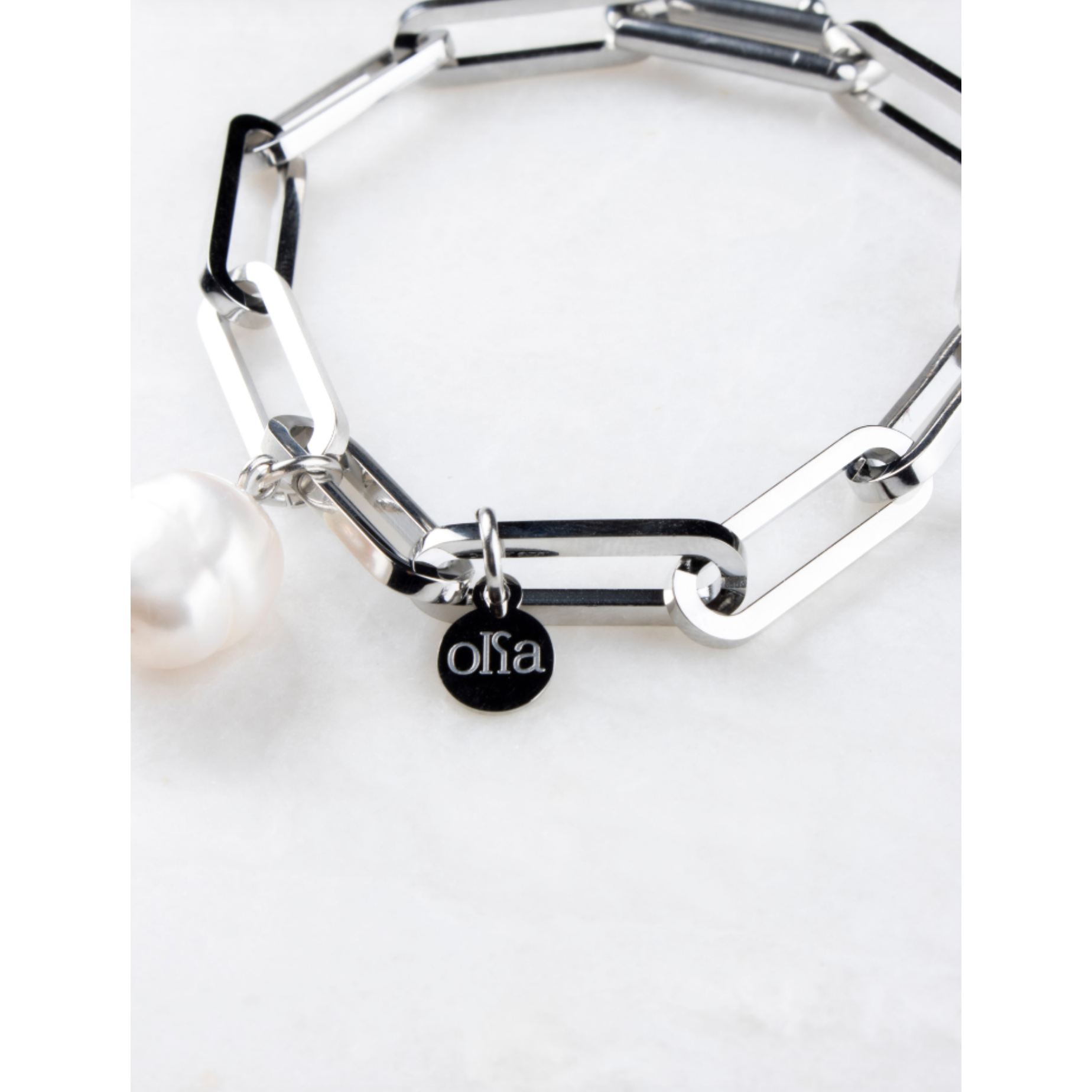 The Belinda Bracelet from Olia Jewellery is a bold, contemporary piece designed to elevate everyday styling. Featuring chunky paperlink chains in polished silver-plated stainless steel, it is finished with a beautiful baroque freshwater pearl charm that adds a soft, organic contrast to the modern metal links. Designed as part of Olia’s waterproof collection, this bracelet is made for effortless wear from day to night.