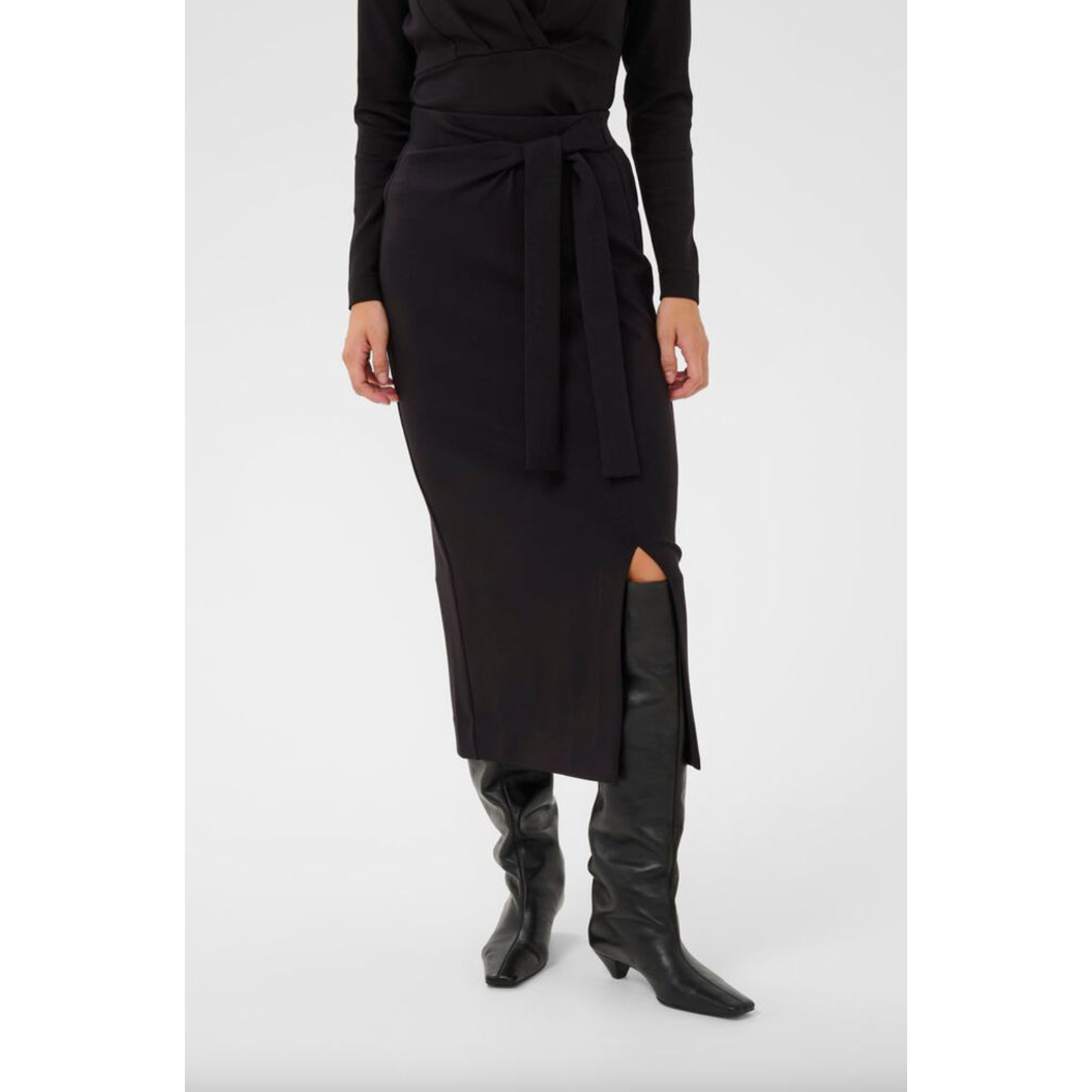 The InWear TriIW VincentIW Knot Skirt in Black is a sleek, modern wardrobe staple designed with a flattering fitted silhouette. Crafted from a soft knitted modal blend, it features an elegant knot detail at the waist that adds gentle shaping and a refined twist. The elasticated waistband ensures comfort, while the ankle-length cut creates a long, clean line that feels effortlessly sophisticated.