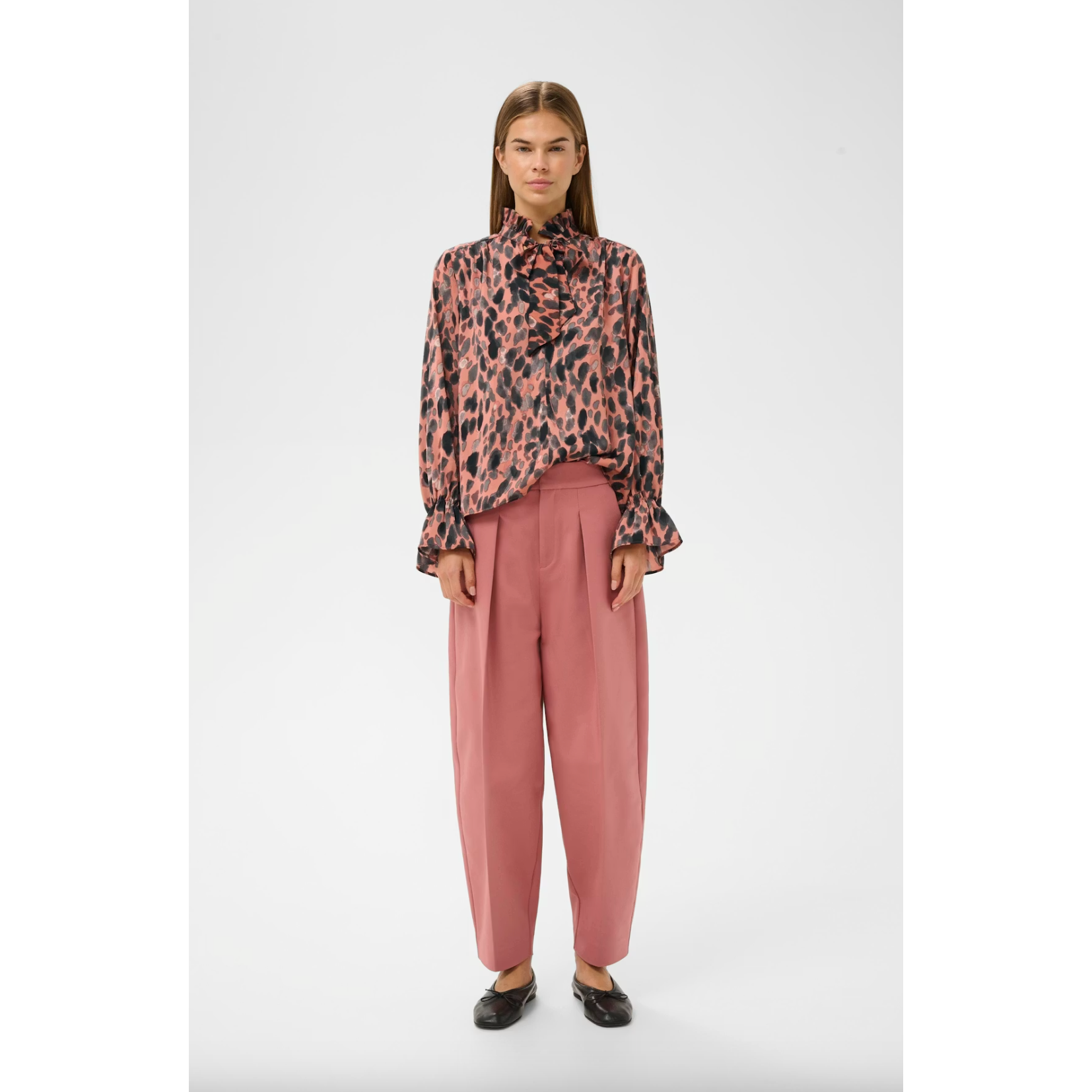 The InWear GracieIW Blouse in Pink Leopard brings a bold, feminine twist to a timeless silhouette. Designed with a high ruffled neckline and elegant tie detail, it blends playful print with refined styling. The long sleeves fall into soft flared cuffs, while the straight, loose fit keeps the look effortless and flattering. Crafted from lightweight polyester, it drapes beautifully and feels comfortable for all-day wear.