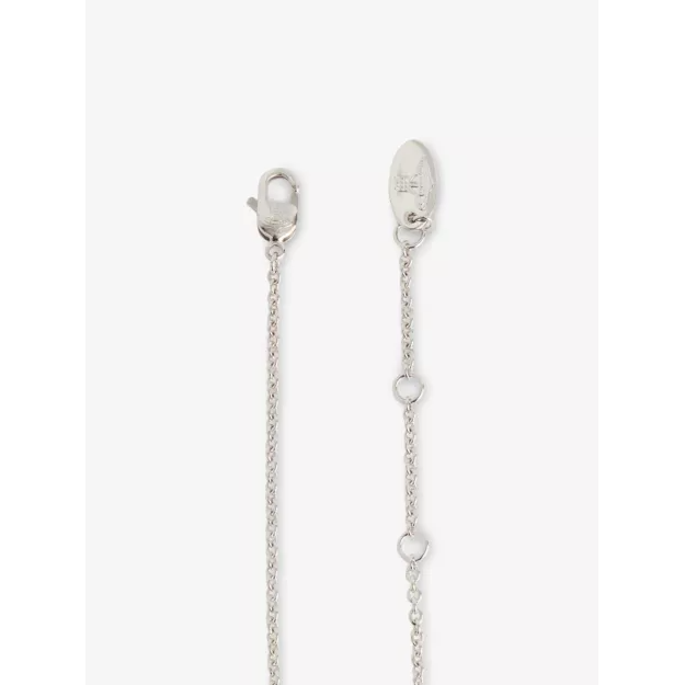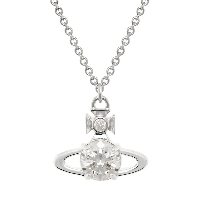 The Vivienne Westwood CZ Reina Large Pendant Necklace in Platinum/White is a striking interpretation of the house’s iconic orb motif. Finished in cool platinum tones and adorned with sparkling crystal embellishments, this statement pendant captures the light beautifully from every angle.