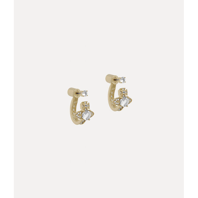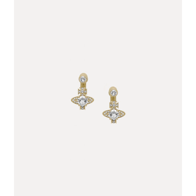 The Vivienne Westwood Maitena Earrings feature a sculptural, dual-component silhouette designed to curve gently beneath the earlobe. Finished in warm gold-tone plating, each earring is adorned with the house’s signature orb motif, highlighted with white faceted cubic zirconia crystals and pavé-set stones that catch the light beautifully.