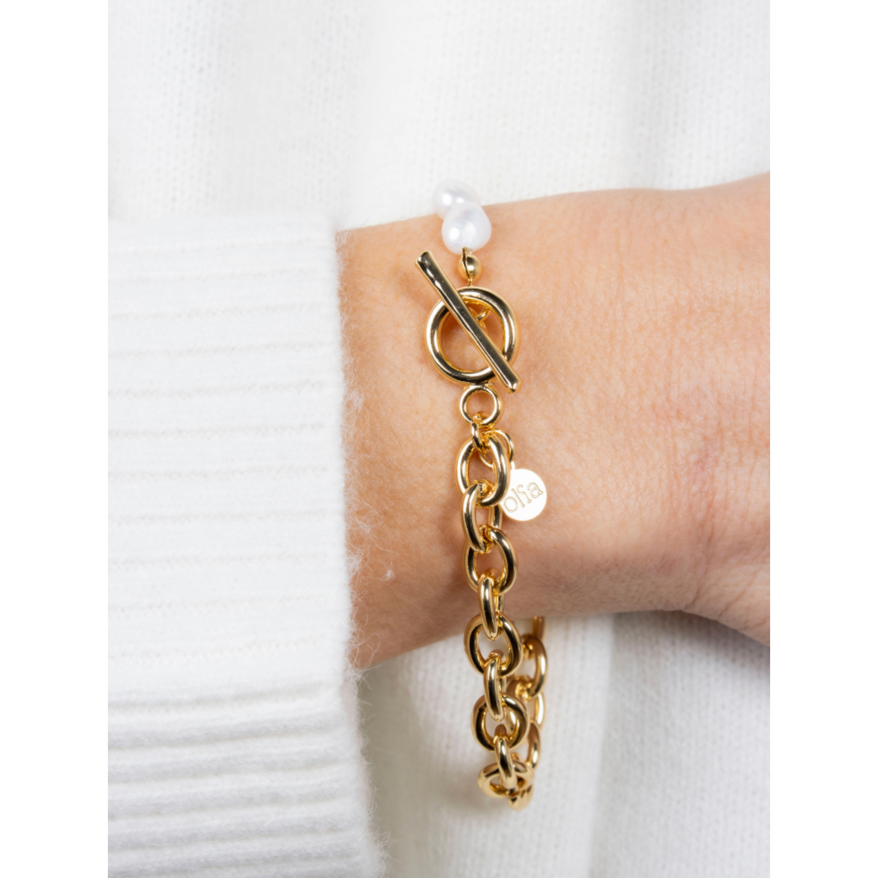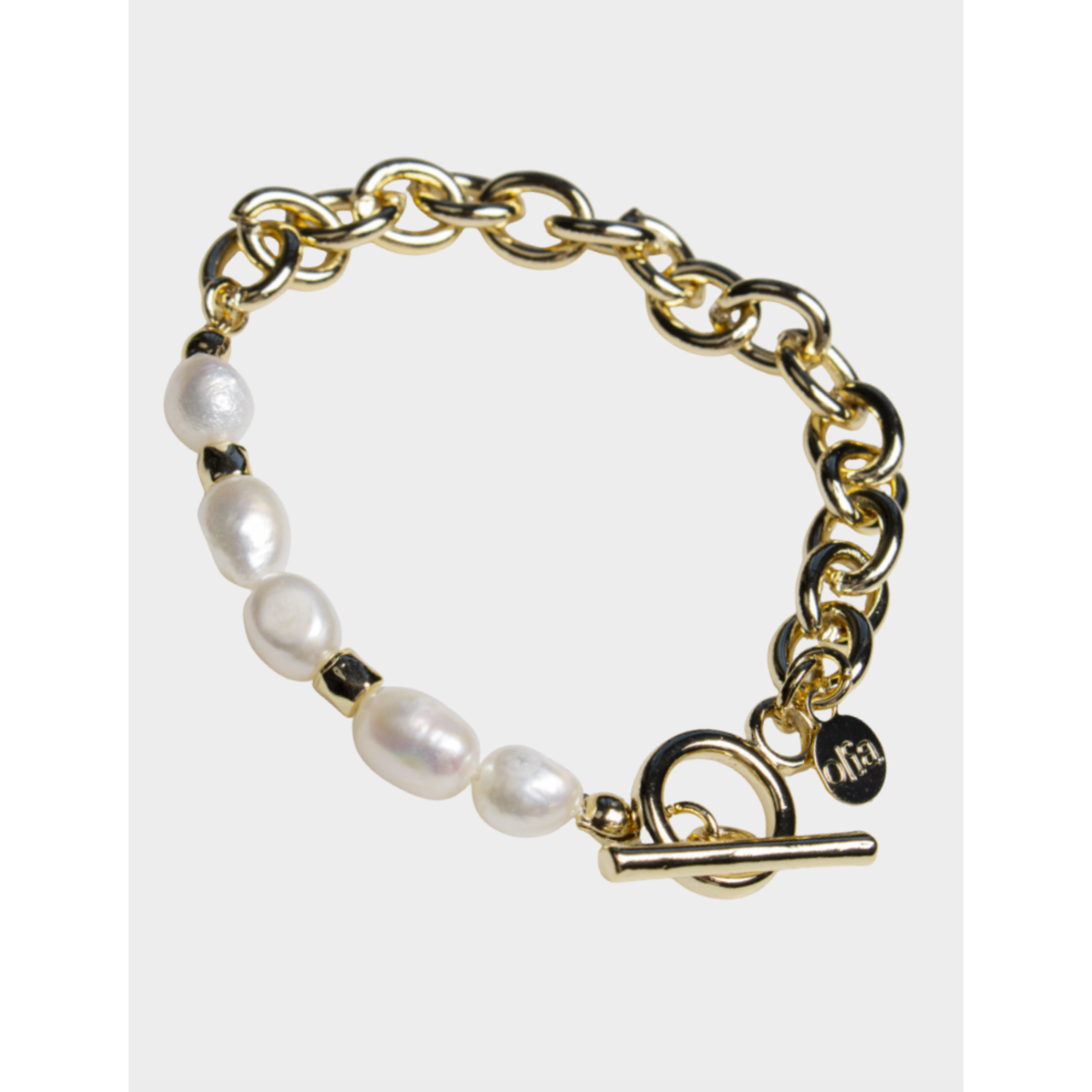 The Flora Bracelet from Olia Jewellery combines modern chain design with the timeless elegance of freshwater pearls. Featuring a mix of polished gold chain links and organic baroque pearls, the bracelet is finished with a stylish T-bar fastening that adds a contemporary touch. Effortlessly elegant, it’s a versatile piece designed to elevate both everyday outfits and occasion looks.