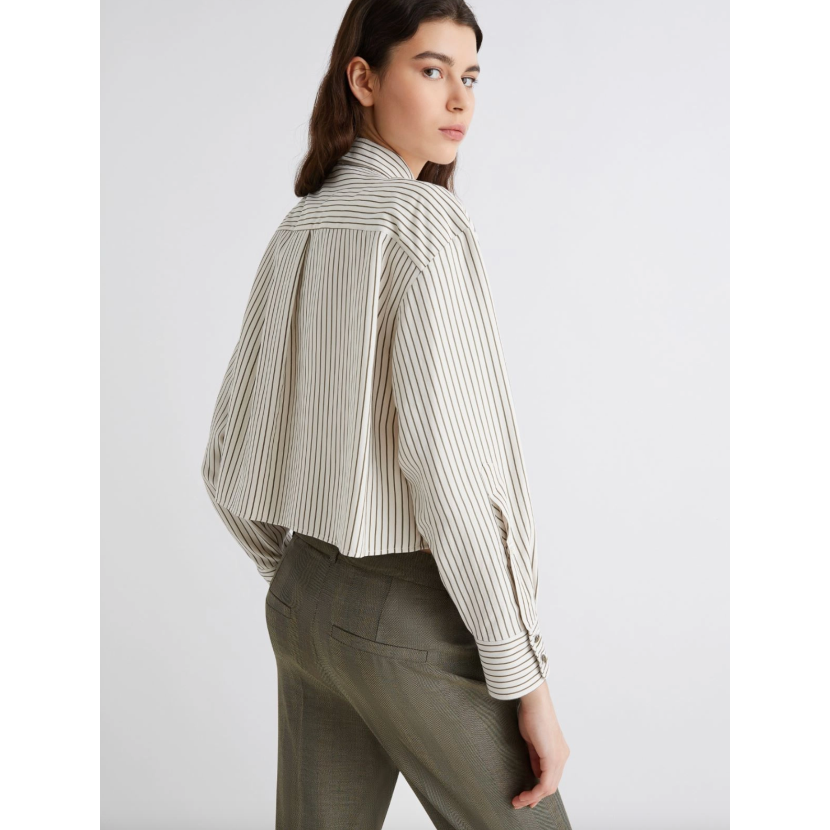 We love how this shirt combines classic detailing with an updated, fashion-forward fit. The cropped length gives it a modern edge, while the twill fabric drapes beautifully with a hint of lustre. It’s a statement piece that feels both smart and easy — equally at home with tailored trousers or denim.