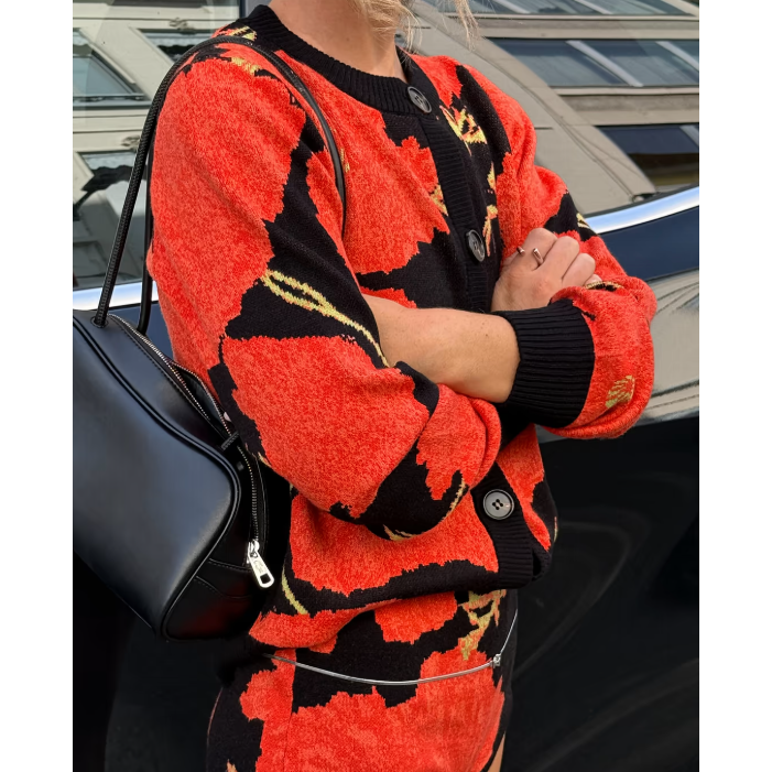 The Black & Red Poppy Cardigan from Never Fully Dressed is knitted in a luxe, weighty soft-touch fabric that feels premium and comfortable. Designed with wide sleeves and a slightly oversized, boxy fit, it features a striking black base with bold red poppy print. Leopard print trims along the neckline and button stand bring signature NFD flair, while the button-up fastening adds practicality.