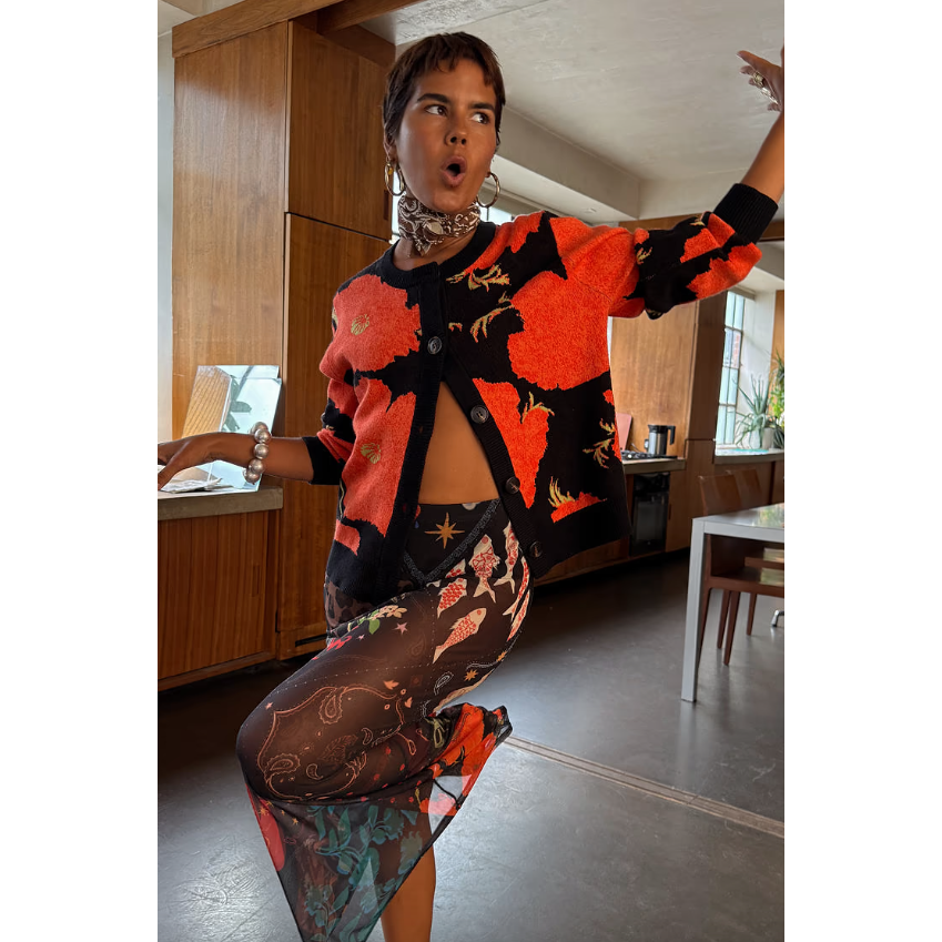 This cardigan is a bold, feel-good layer that works season after season. The mix of red poppies and leopard detailing creates a standout look while remaining versatile. Style it casually with denim and loafers, or layer over the matching poppy mesh dress for a confident day-to-night outfit. Its oversized cut makes it easy to throw on and instantly elevate your look.
