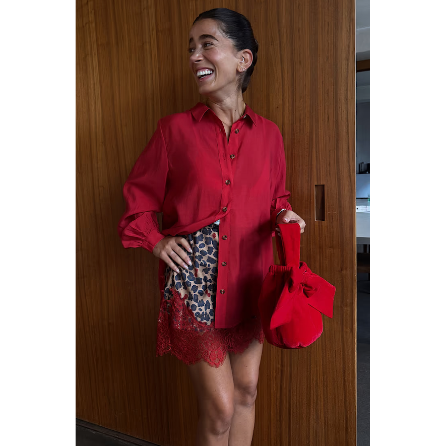Pair the Miley Shirt Cherry with straight-leg jeans and loafers for chic everyday styling, or layer it under a blazer with statement jewellery for an elevated office look. For off-duty days, wear it open over a white vest with wide-leg trousers for a laid-back feel.