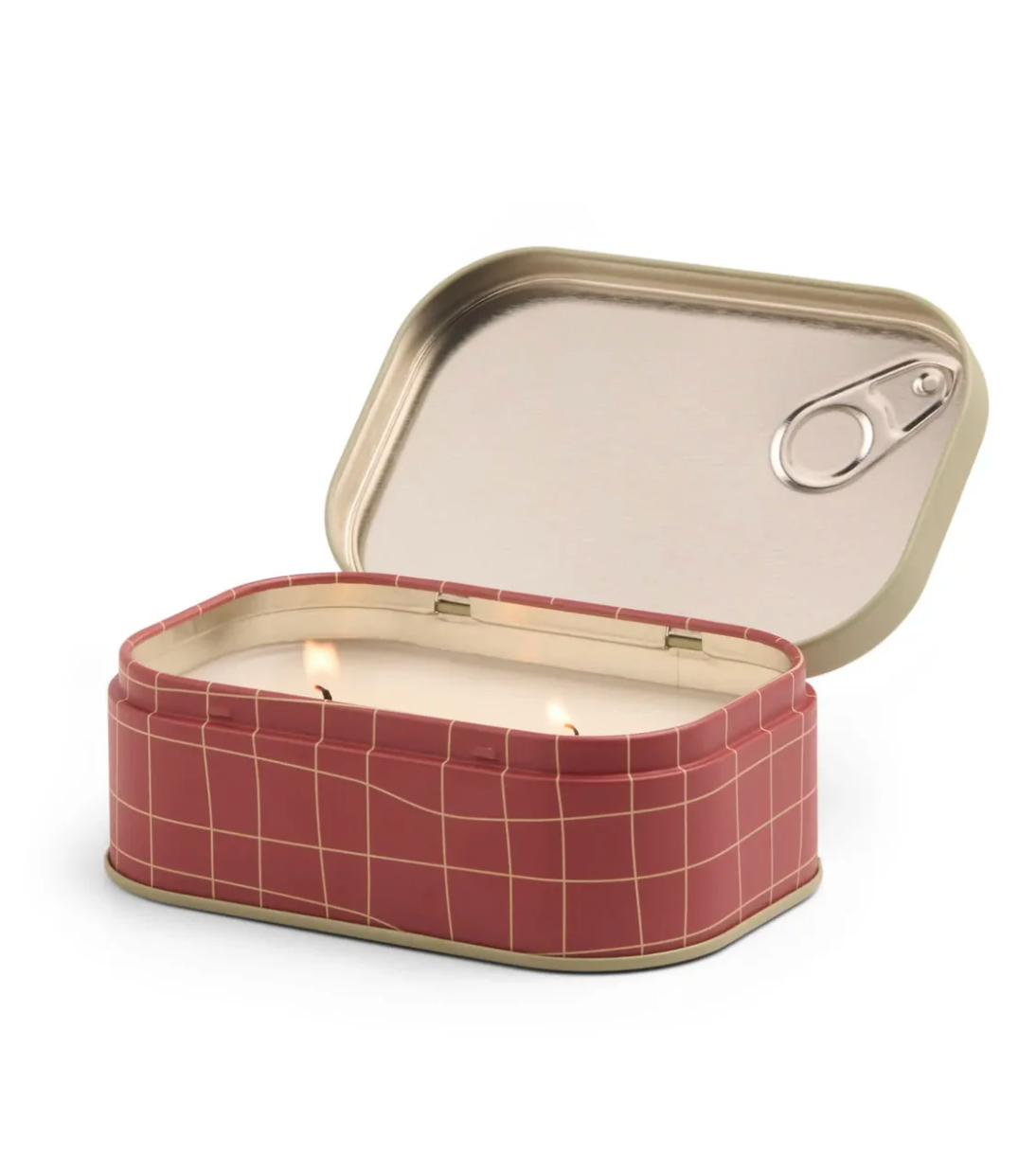 Two-wick sardine-style tin with faux pull-tab lid