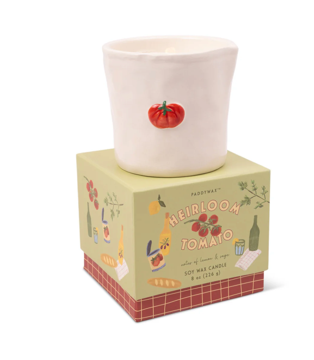 The Paddywax Bistro Heirloom Tomato Candle brings a playful yet sophisticated touch to the home, combining artisan fragrance with beautifully considered design. Part of the Paddywax Bistro collection, this 8 oz candle is housed in a ceramic vessel featuring a charming hand-painted tomato icon, inspired by the warmth and character of European cafés. With its fresh, herbaceous fragrance and thoughtful presentation in a sliding gift box, it’s designed to create an inviting atmosphere the moment it’s lit.