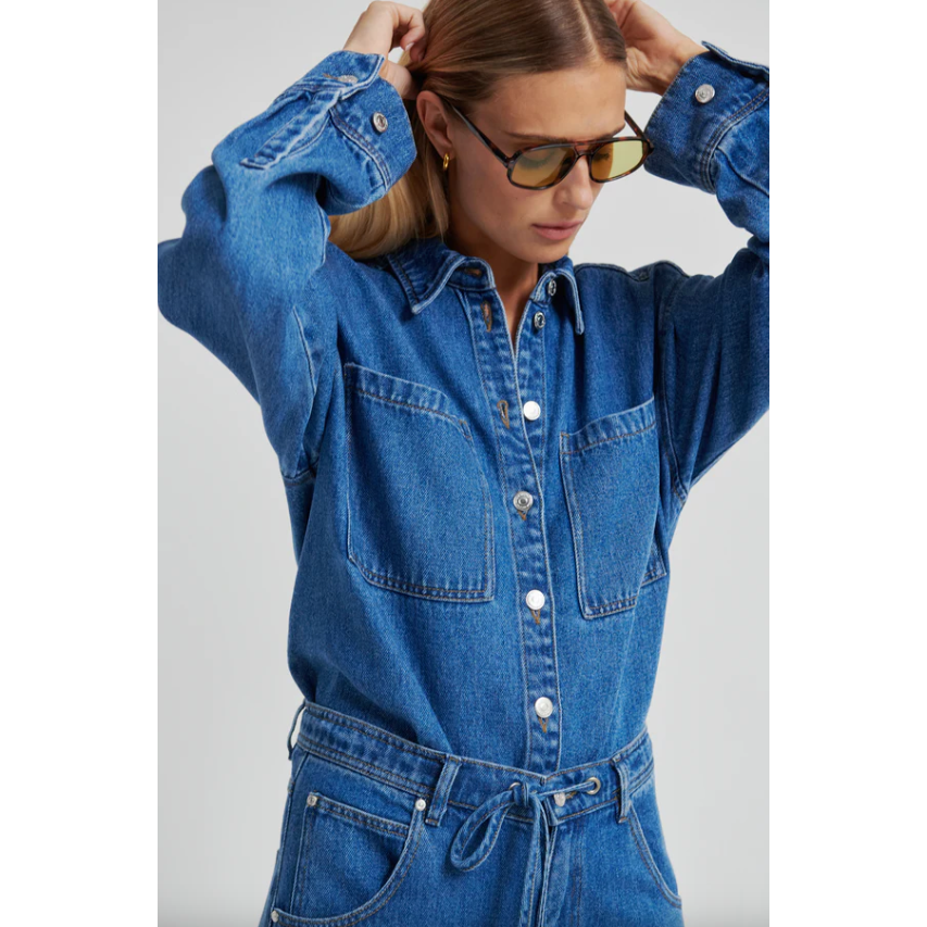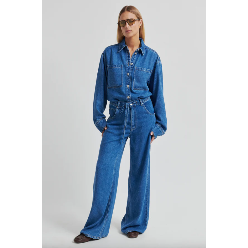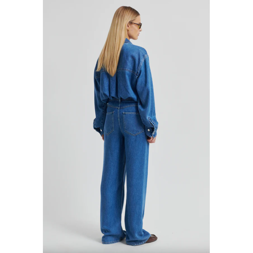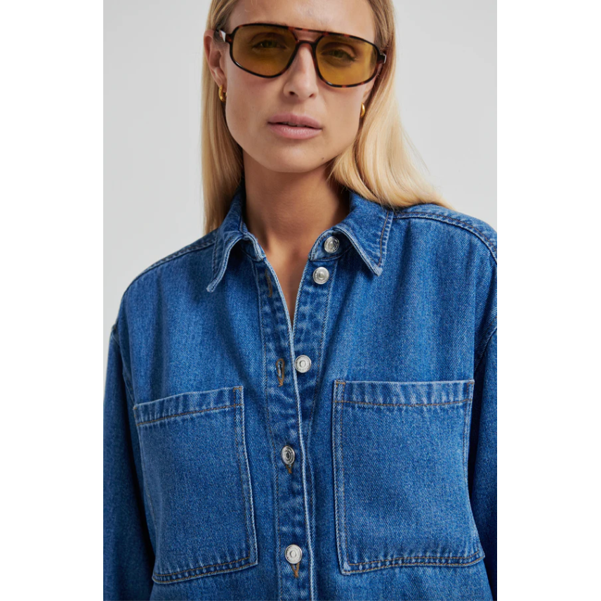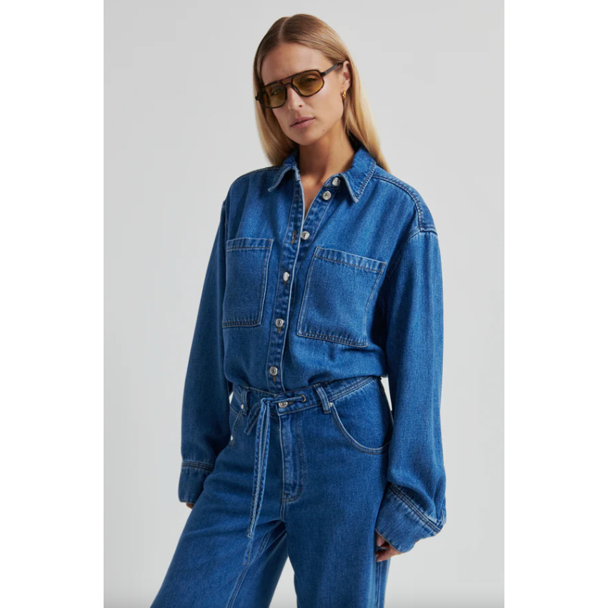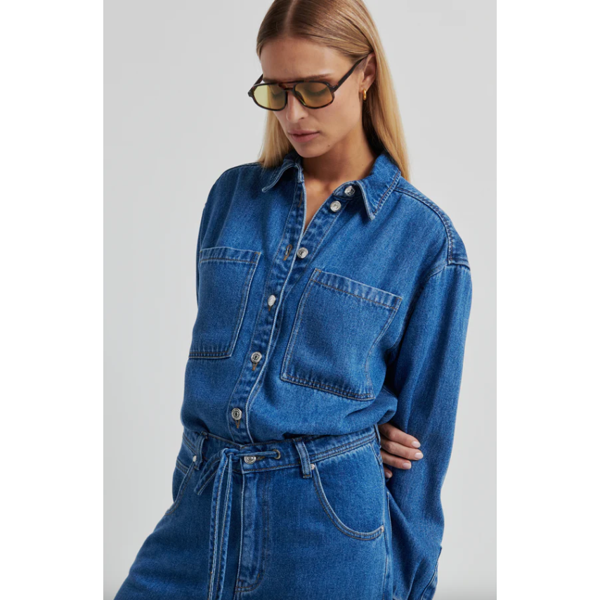 The Second Female Irvina Denim Shirt in denim blue is a soft, draped take on a classic wardrobe staple. Crafted from fluid lyocell denim with a faded blue wash, it offers the look of traditional denim with a lighter, more effortless feel.