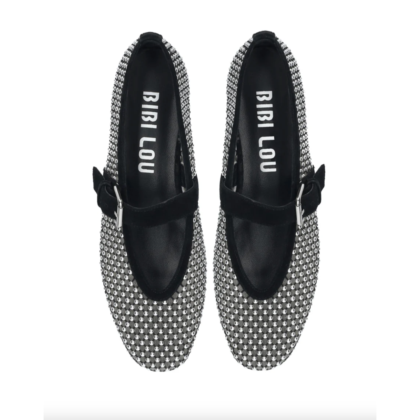 The Studded Black Ballet Pumps from Bibi Lou are a bold reimagining of a timeless classic. Crafted in black mesh-effect synthetic with striking silver-tone stud embellishments, they feature a thick buckle strap and soft leather lining for lasting comfort. Lightweight at just 300g, these pumps offer contemporary edge and versatile style, making them the perfect finishing touch for any outfit.