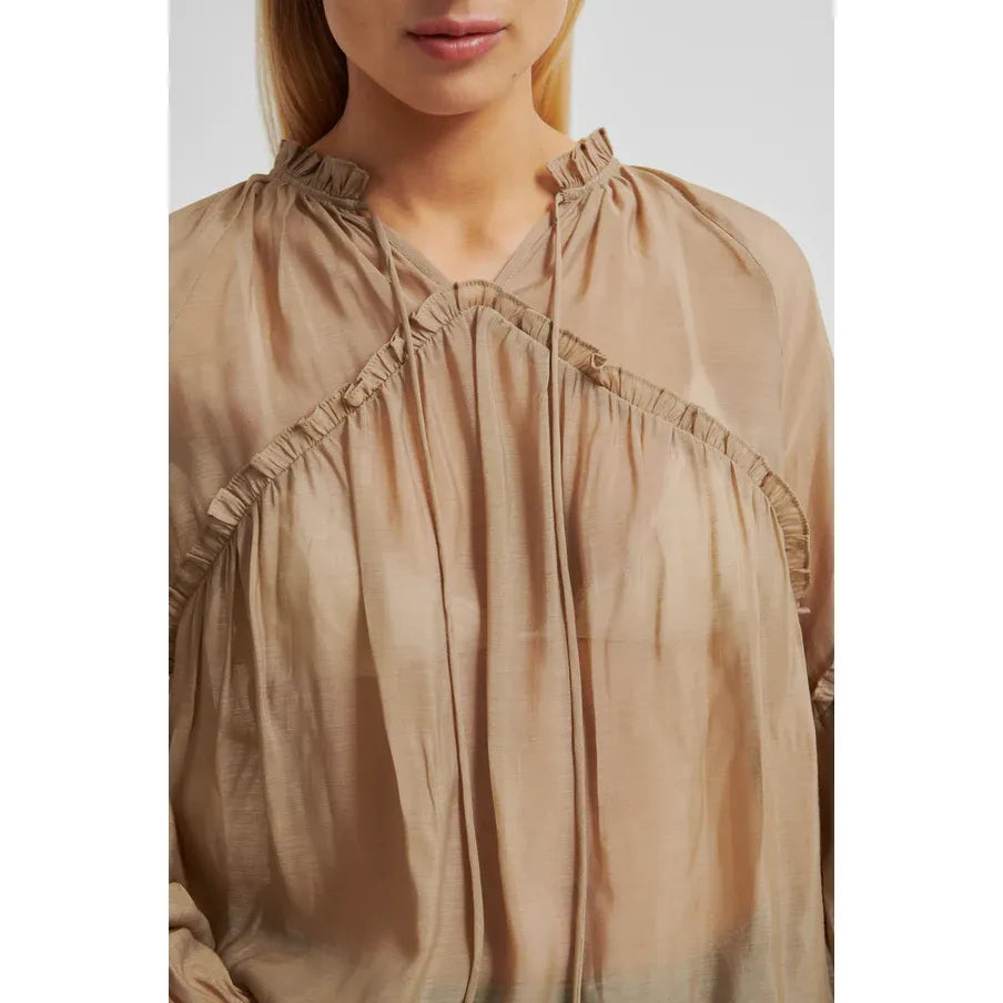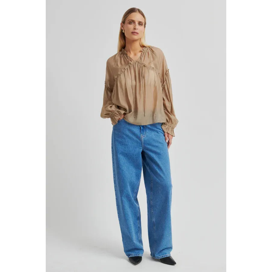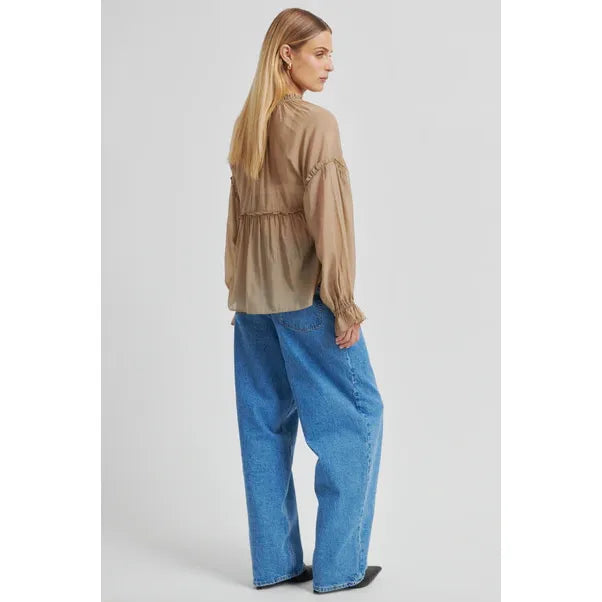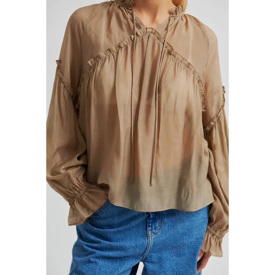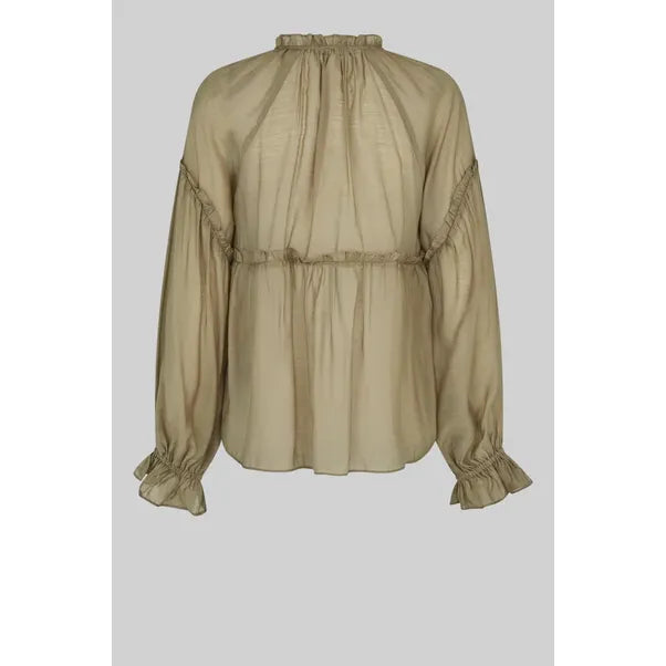 The Tundra Ruffle Blouse in Khaki by Second Female is a beautifully feminine piece crafted from a lightweight, semi-sheer fabric with a subtle sheen. Designed with delicate frill detailing at the collar, cuffs and through the body, it offers soft movement and texture throughout. Finished with a tie fastening at the neckline and long sleeves with elasticated cuffs, it falls into a loose, airy silhouette that feels effortlessly elegant.