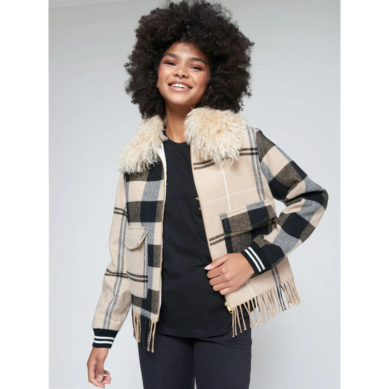 A true head-turner for the colder months, this Vilagallo bomber jacket takes classic check and gives it a bold, contemporary twist. Cut from a soft wool-blend in shades of beige, black, and grey, it features a short, straight silhouette with a playful fringe hem and contrast striped ribbed cuffs. The detachable faux fur collar in beige adds a luxe touch (or take it off for a more relaxed look), while the printed lining and gold zip add those signature Vilagallo details we know and love.
