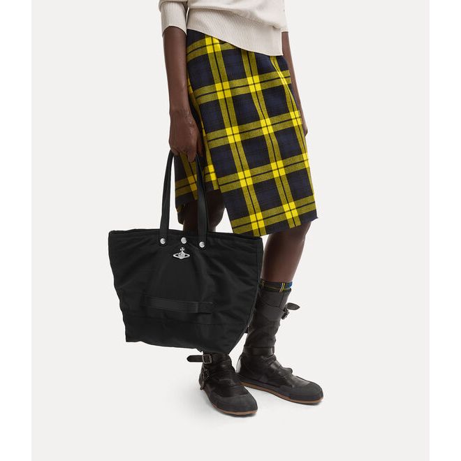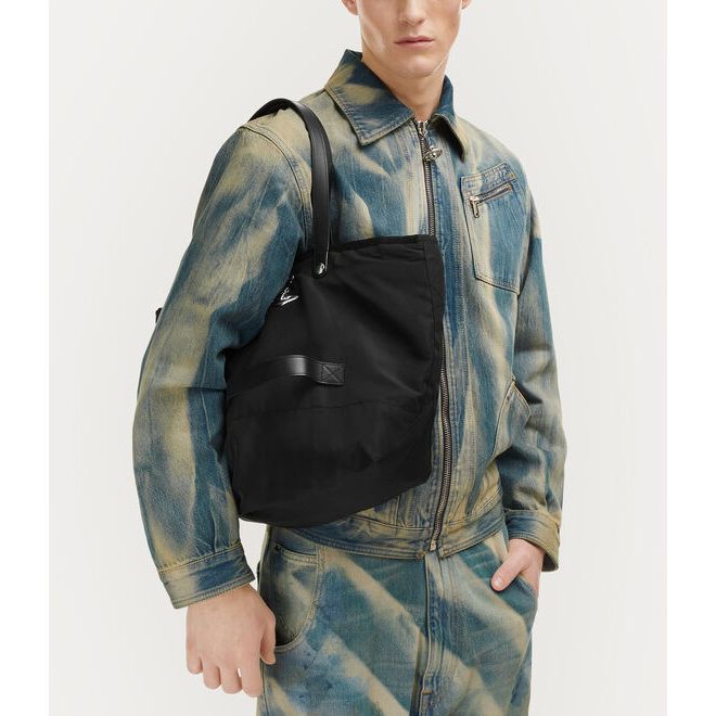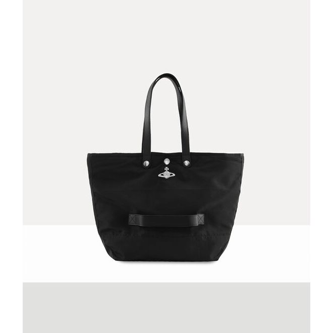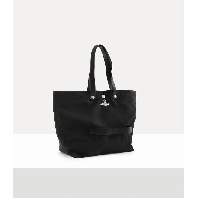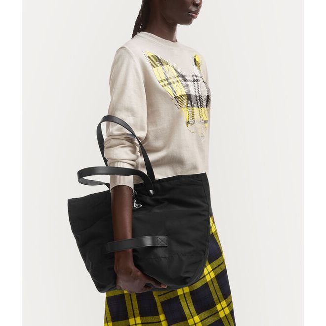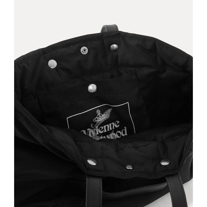 The Vivienne Westwood Utility Small Shopper in Black is a hand-crafted unisex design made in Kenya through the Ethical Fashion Initiative. Inspired by the structure of parachute jackets, it features a durable recycled polyester construction with a spacious interior and a quilted lining finished with the house’s raw aluminium Orb motif. With silver-tone hardware and branded popper closures, it blends function, style and ethical craftsmanship in one refined everyday piece.