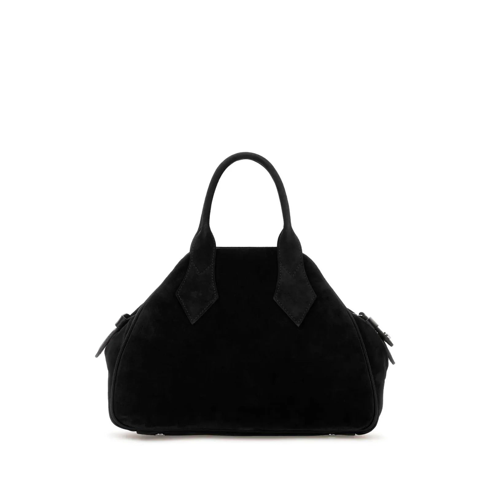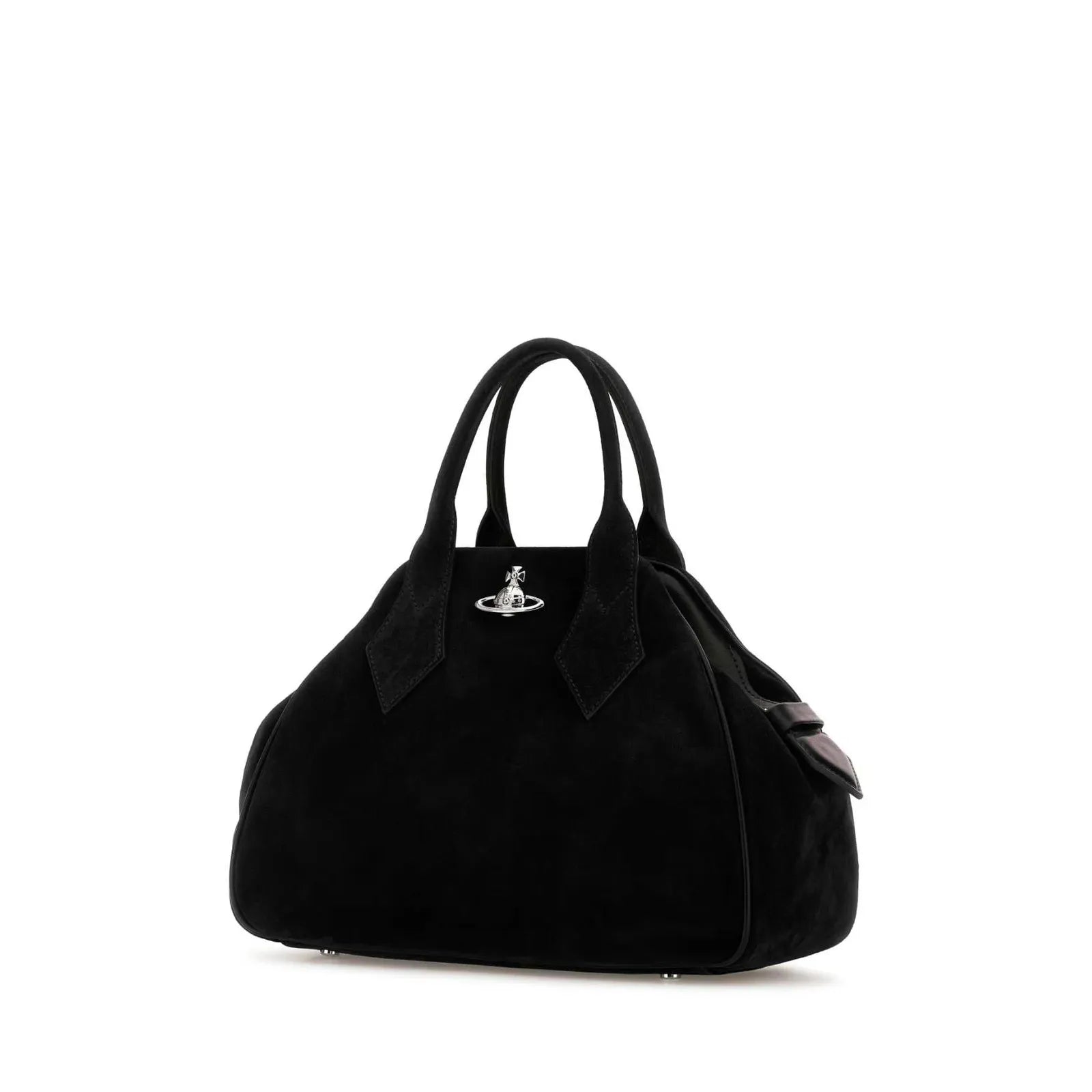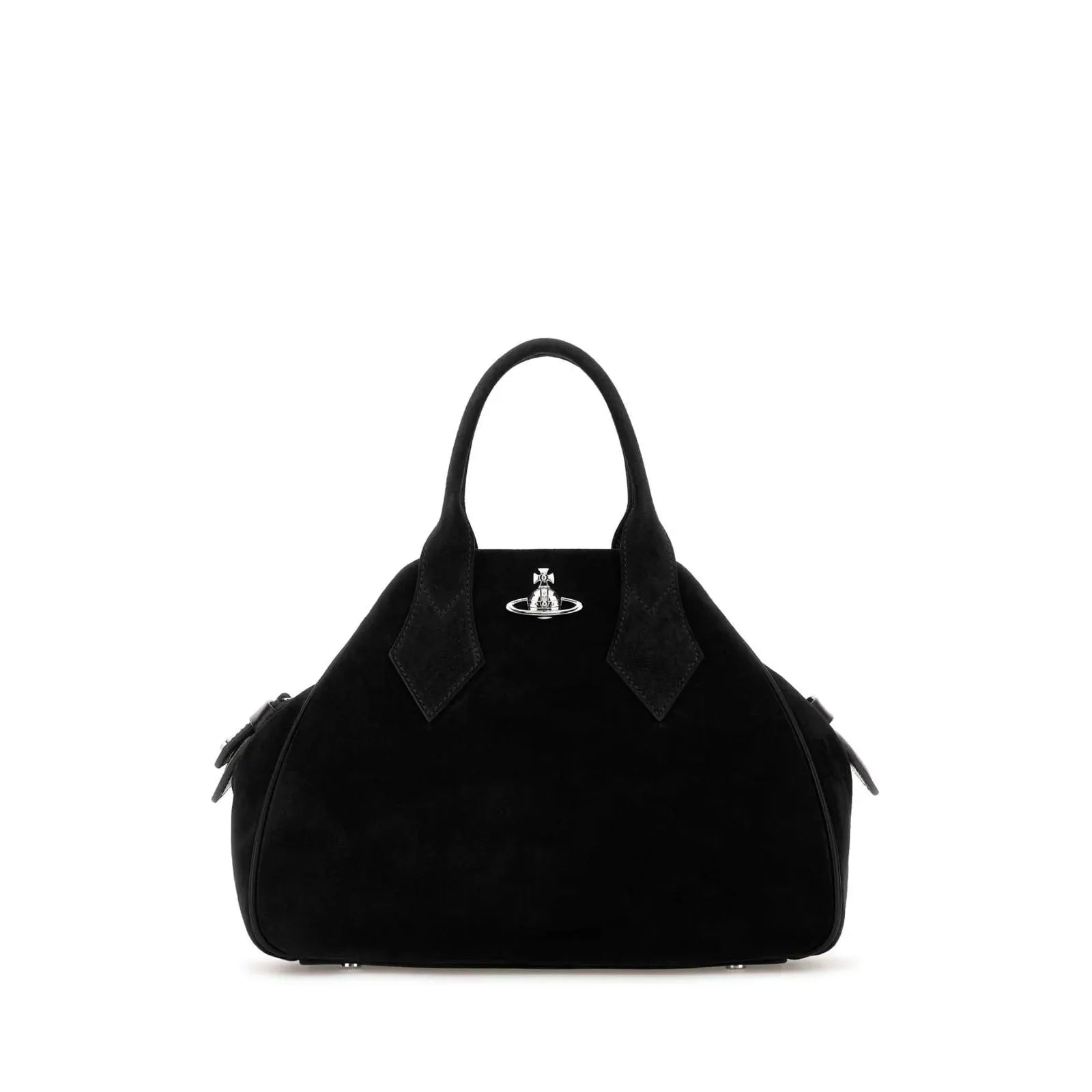 The Vivienne Westwood Yasmine Medium Bag in Black is a refined, sculptural top-handle design crafted from smooth calfskin suede. Understated yet unmistakably Westwood, it features twin rolled handles, the signature silver-tone Orb hardware and clean side press-stud tabs that subtly adjust the shape. Finished with bumper studs at the base for protection and a structured silhouette that holds its form, it’s an effortlessly elegant everyday handbag.