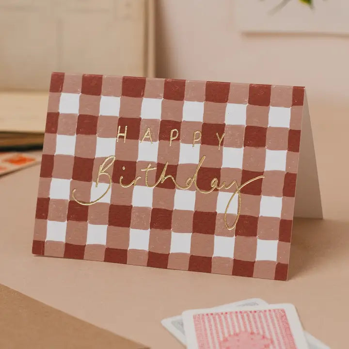 'Happy Birthday' Brown Gingham Gold Foil Birthday Card
