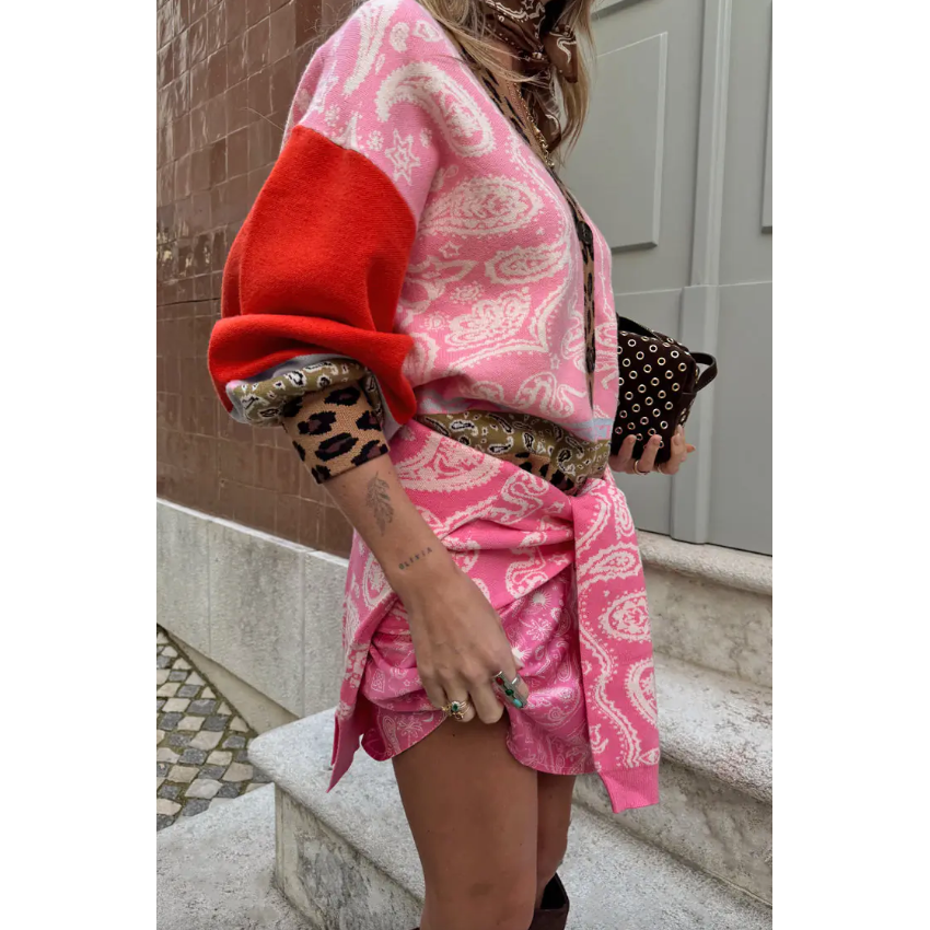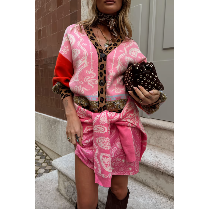The Splice Bandana Cardigan by Never Fully Dressed is crafted from their signature soft-touch knit that feels beautifully weighty and luxe on the body. Designed in a striking pink paisley print, it’s finished with bold accents of bright red and contrasting leopard and olive bandana prints along the cuffs and hem. With classic button fastening and a flattering silhouette, it’s a statement knit that blends comfort with personality.